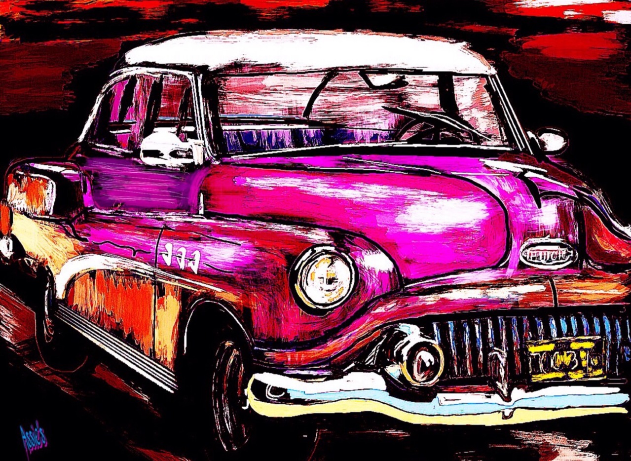 Zon Abstract Modern Rood Oranje Blauw Paars Digitaal Kleurrijk Tekening Painting Roze Vrolijk Sun Auto Car Digital Ouderwets Colorfull Cuba Oldtimer Draw Kunstkaart Buck Automobiel