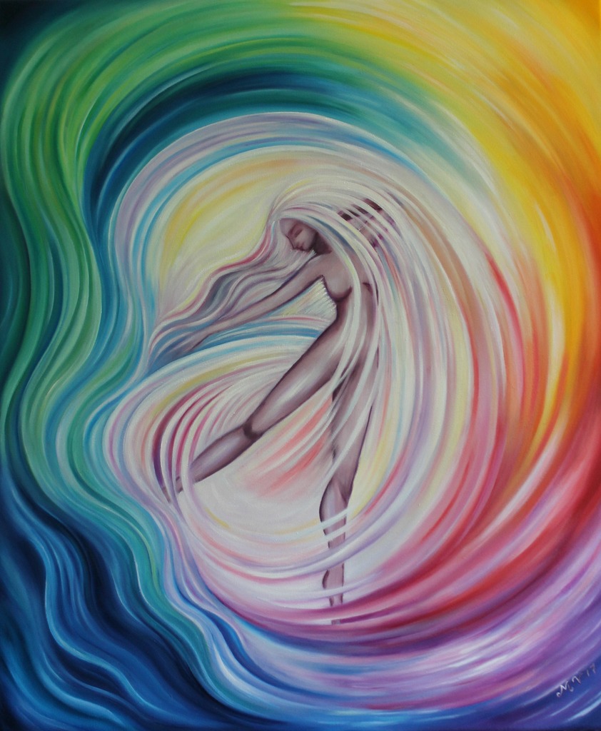 Een intuïtief schilderij met de betekenis van ontwaken.Vanuit de danseres komt een nieuwe energie vrij, kleuren ontwaken.Posters van dit werk zijn op aanvraag te koop.