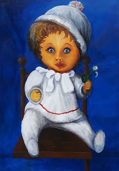 Mijn buurvrouw van 93 jaar heeft haar huis vol met poppen. Liefje is één van haar favorieten. Haar poppenstoeltje is enigzins wankel. Liefje heeft model gezeten voor dit schilderij.