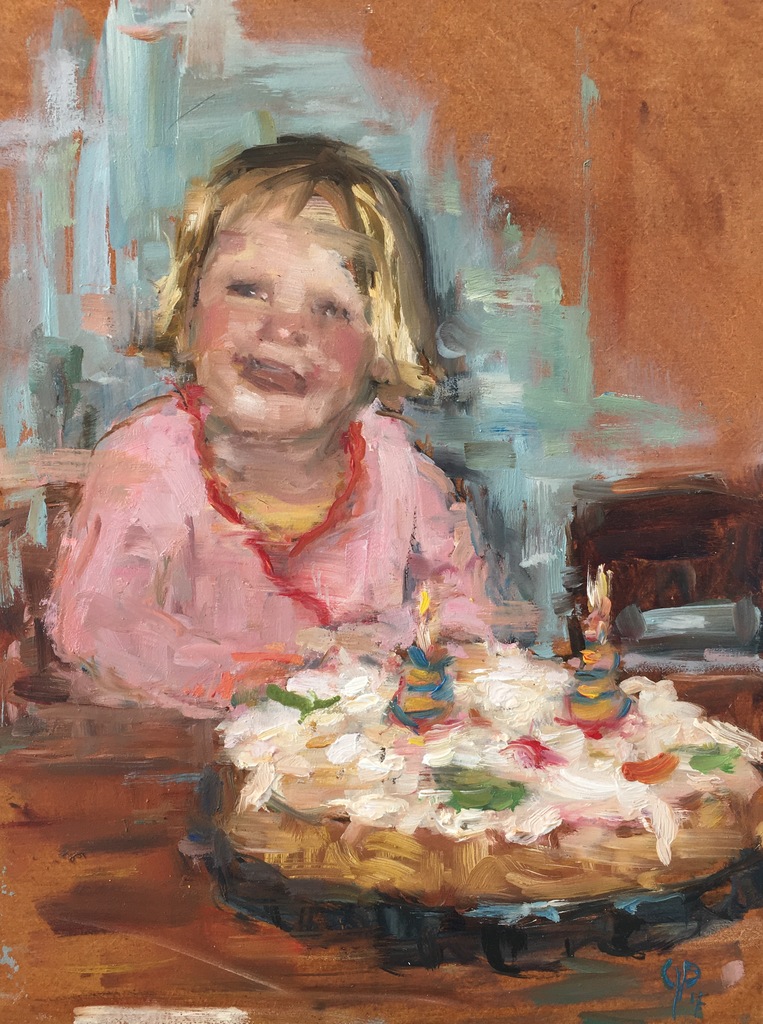 Schilderij Portret Kind Model Olieverf Tafereel Roze Sfeer Verjaardag Taart Prinsen Yvonne