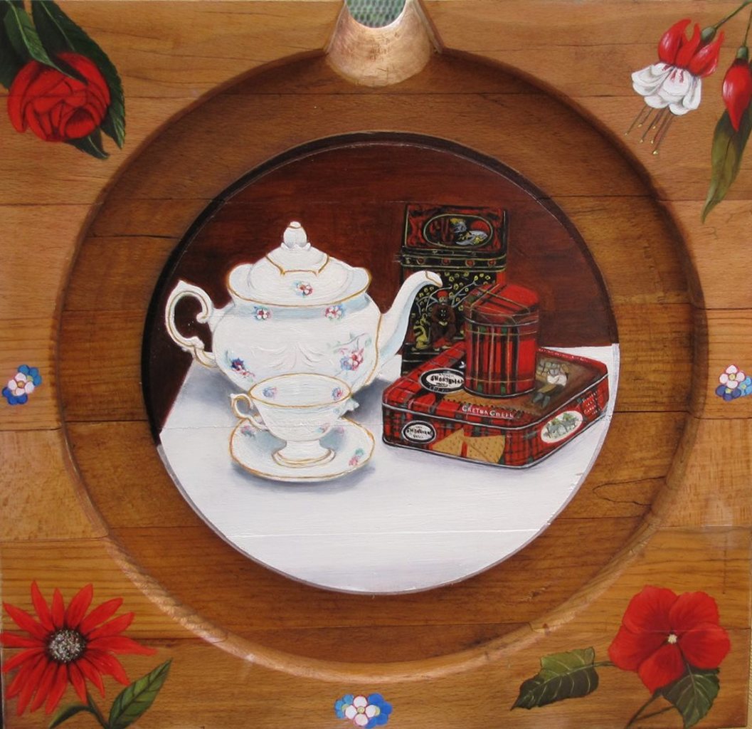memory een stilleven vol herinneringen in olieverf op een paneel van een oude beuken wijnpers bodem het theekopje en de theepot van m'n Moeder de koekjestrommel uit Schotland