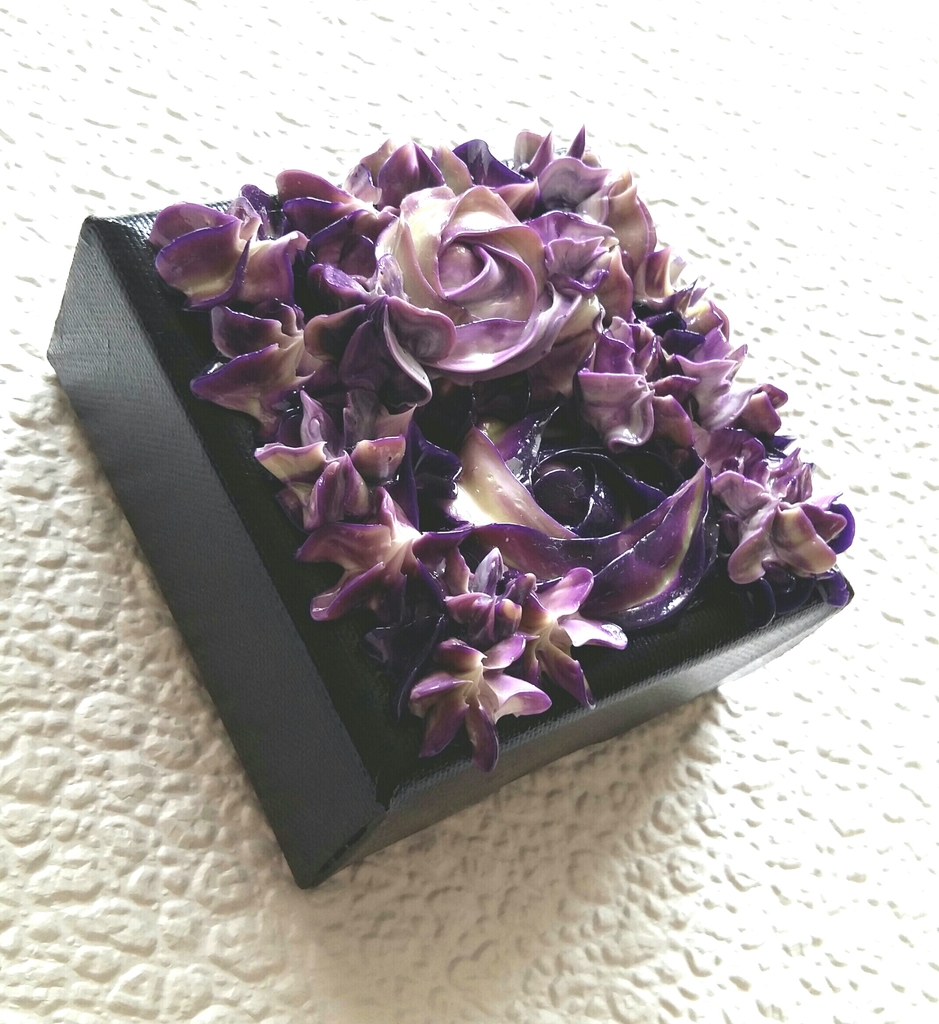 Nr. 002. Kleine verfsculptuur op canvas-blok. De voornamelijk paarse kleuren mengen zich tot een boeiend geheel. De vele verflagen creëren een 3D effect op de canvas. Mijn rozen en bloemen zijn de voornaamste inspiratiebronnen voor mijn verfsculpturen. Deze kleine sculpturen zijn leuk als decoratie op een tafel of dressoir of ze kunnen ook staan op een plank of kast. De canvasblok is incl.de lagen verf ongeveer 6 cm hoog.