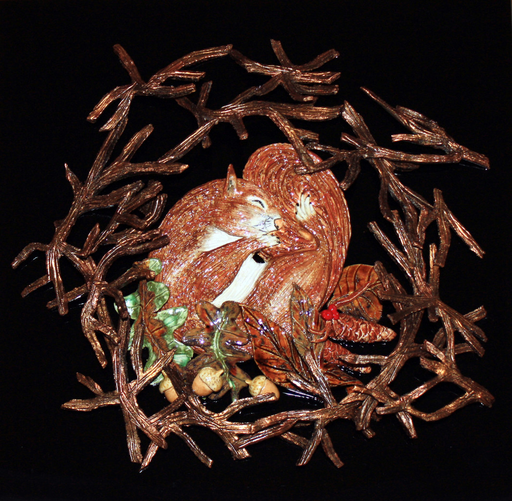 Eekhoorn in winterslaap ,wandobject, keramiek op glas