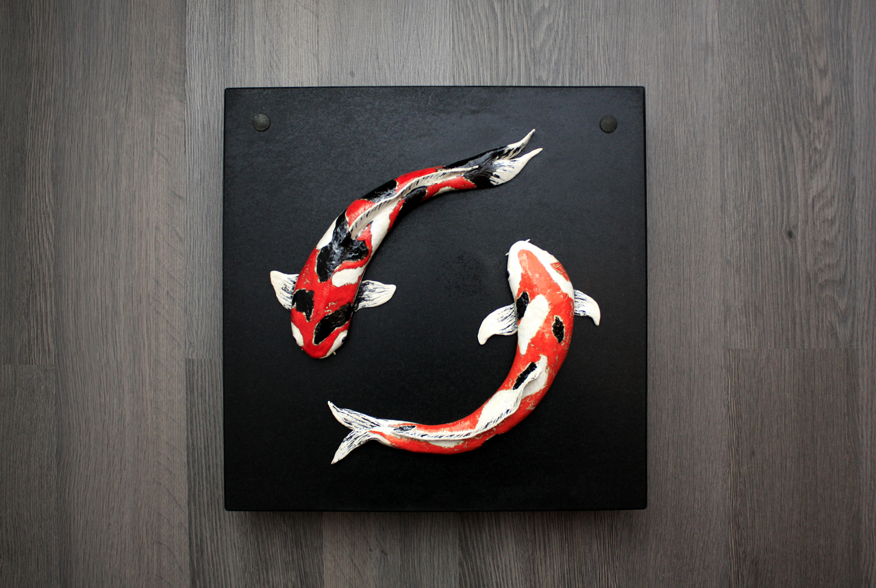 Koi Karpers, keramiek op leisteen, wandobject