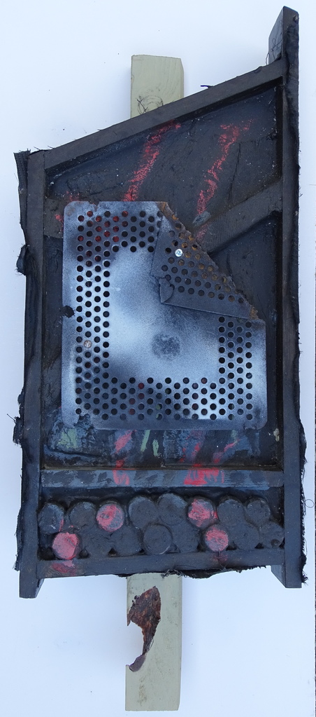 Wanneer je uit elkaar / wordt gehaald, tot componenten / die je vormden / dan kan dat gezien worden als / verrijking, in zover als reductie / kan leiden tot verbetering. (originele assemblage Ni-gres, uiteen gehaald en binnen centraal segment element toegevoegd, 2017, 2019)