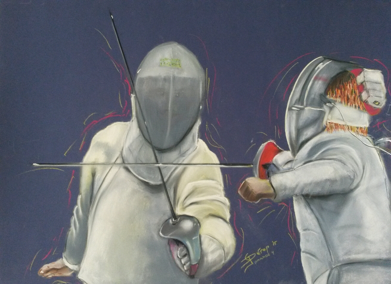 Georges Dérop, kunstschilder met als thema Sport en bewegen. Gefascineerd door het schermen van vroeger tot nu. De spanning die uitgaat van om dat ene moment op doek te zetten inspireert mij. Maar ook de natuur in al zijn pracht en glorie zet ik graag op het doek. Speciaal onderwerp is de geschiedenis van het zwaard. van actie tot en met stilleven, van Romeinen tot heden. En verder maak ik portretten van mijn familie en teken ik dieren en vogels uit de wildernis alsmede huis dieren