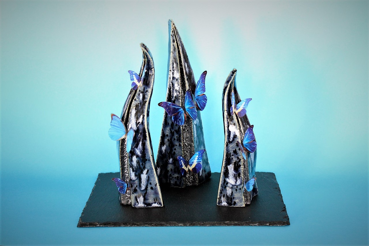 Vlindertuin, keramiek met vlinders op sheet met fotoprint, op leisteen