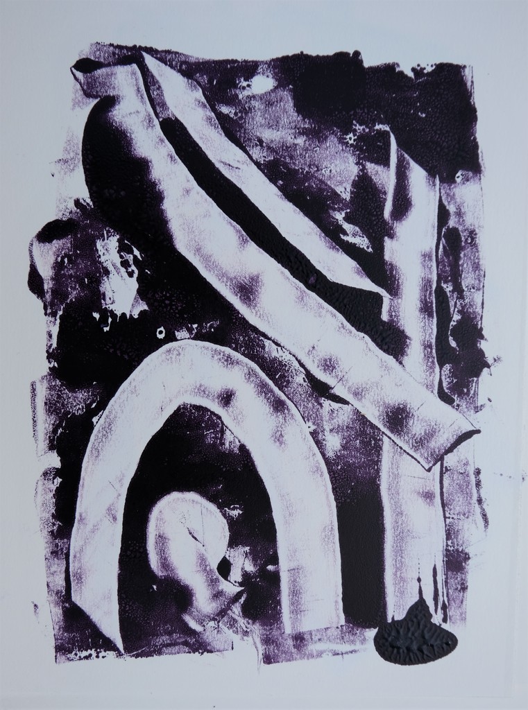 "De route gepland voor vandaag / leek onveilig. // Onze gids stelde voor / dat we het andere pad zouden nemen." (monoprint)
