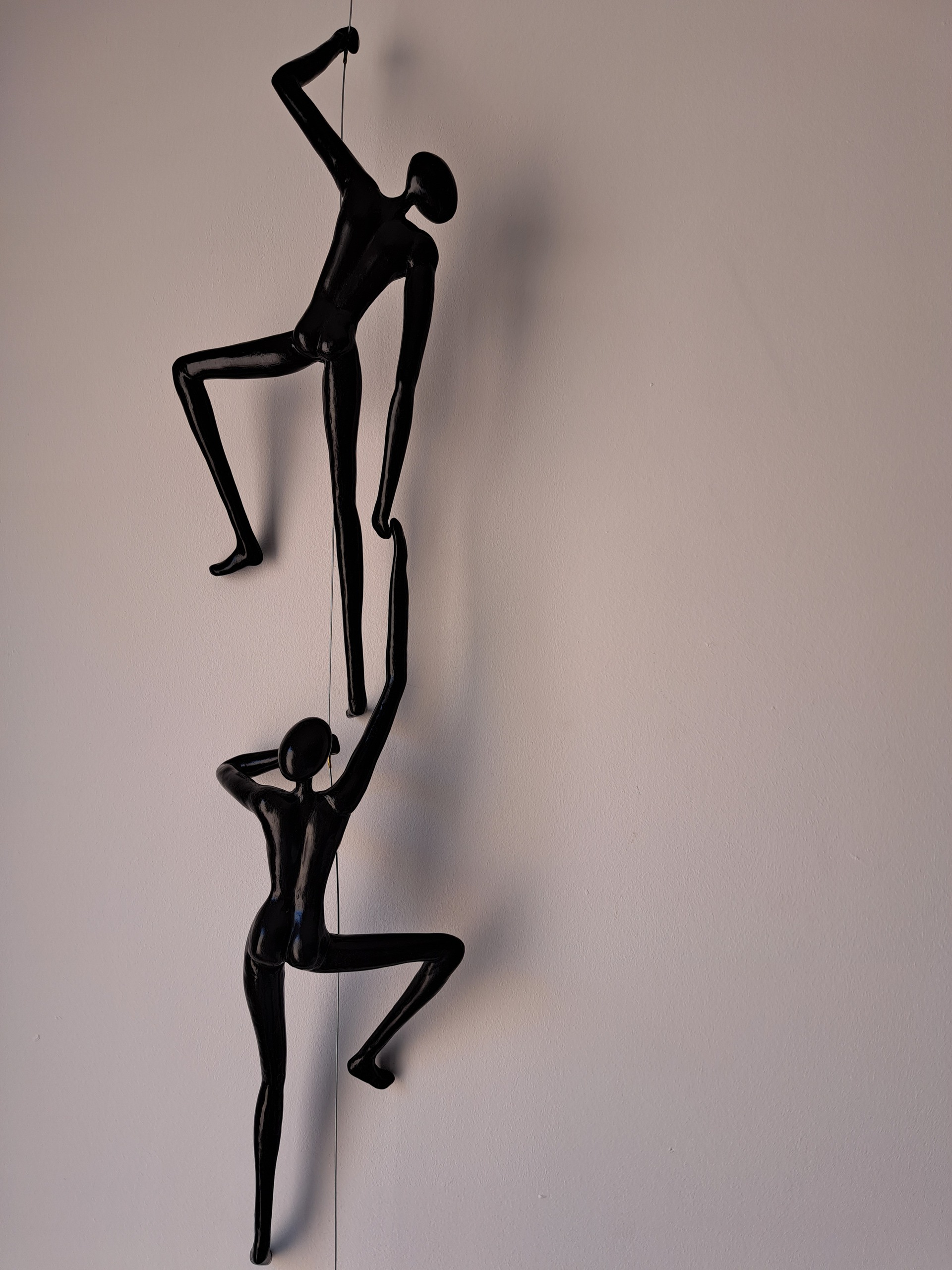 Het duo hangt aan een staaldraad van ongeveer 215 cm lengte. Het minimalistische ophang systeem wordt bij geleverd. Een duo wordt in verschillende houdingen gemaakt, u kunt contact opnemen om van de recente uitvoeringen een foto te ontvangen.
