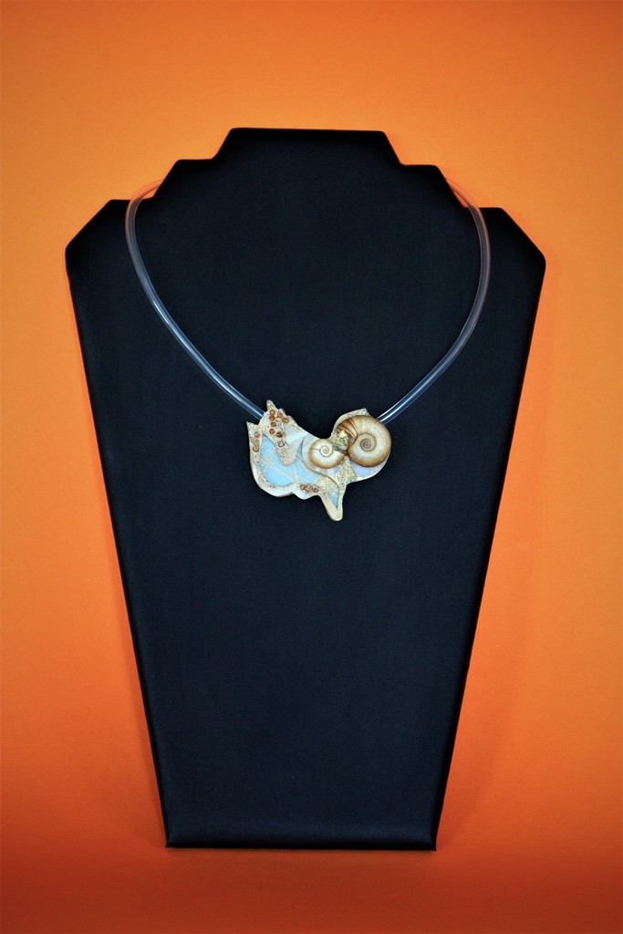 Halssieraad aan zee, pvc klei, schelp, mixed media
