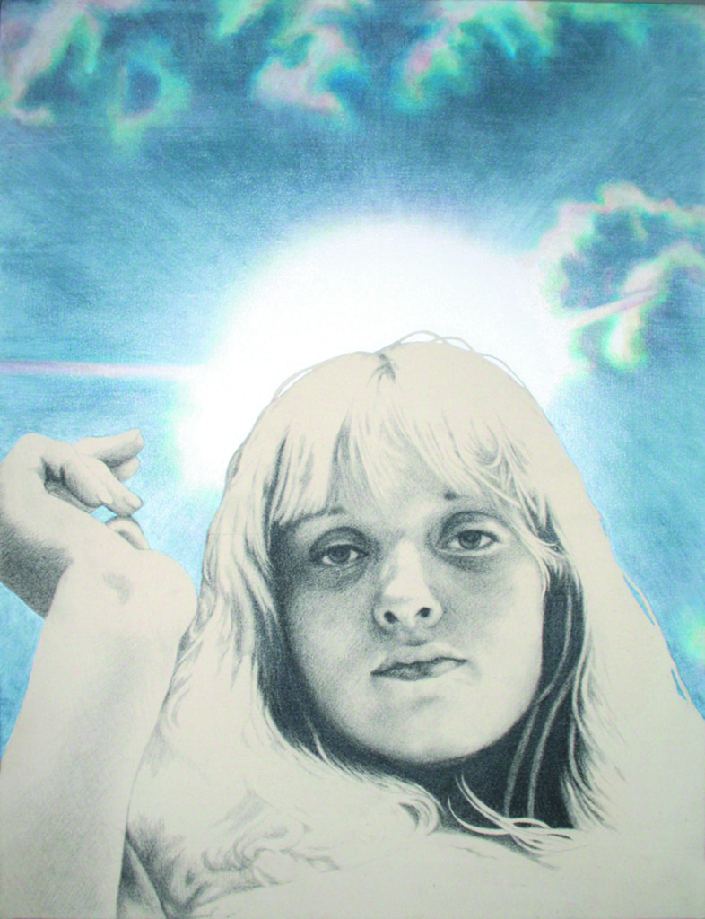 Portret van de moeder van Tamara van den Berg. Potlood en acryl op doek. De uitvoering verwijst naar de Heilige Moeder, met een aureool van licht dat door het wolkendek breekt.