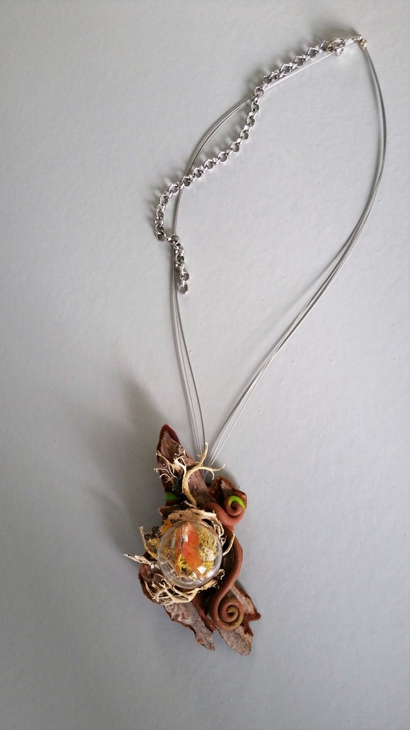 Halssieraad bos, pvc klei, schors,glazen dome, mixed media