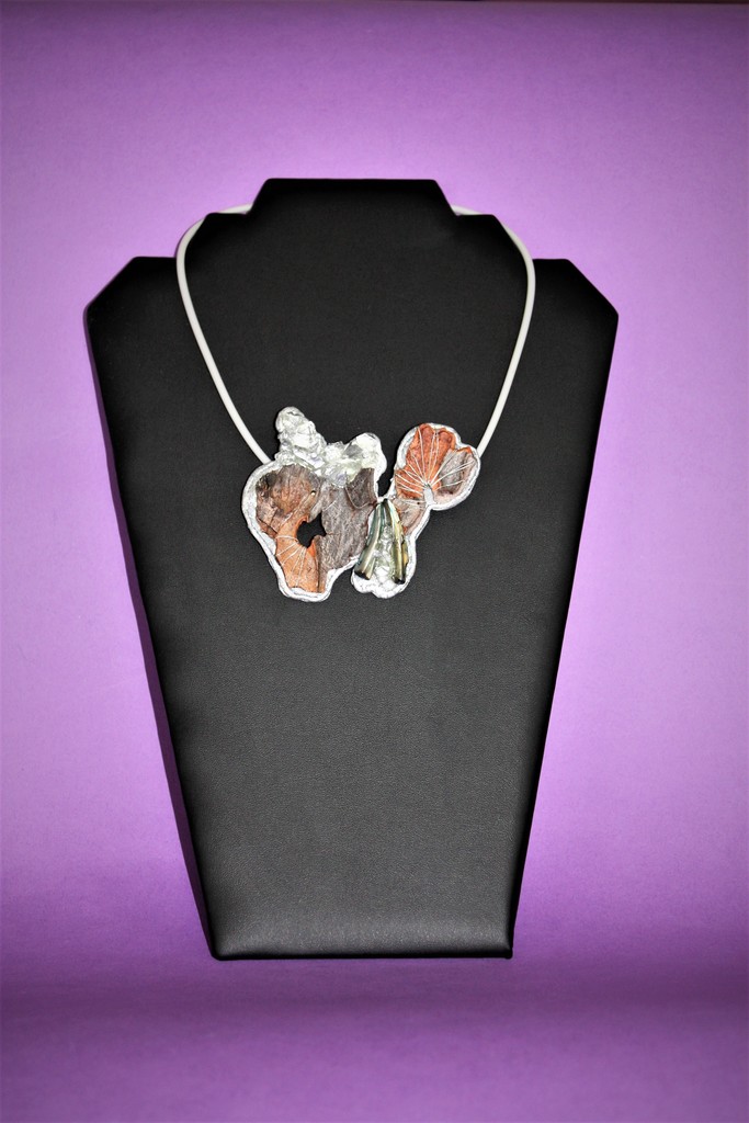 Halssieraad schors, pvc klei, schors, mixed media