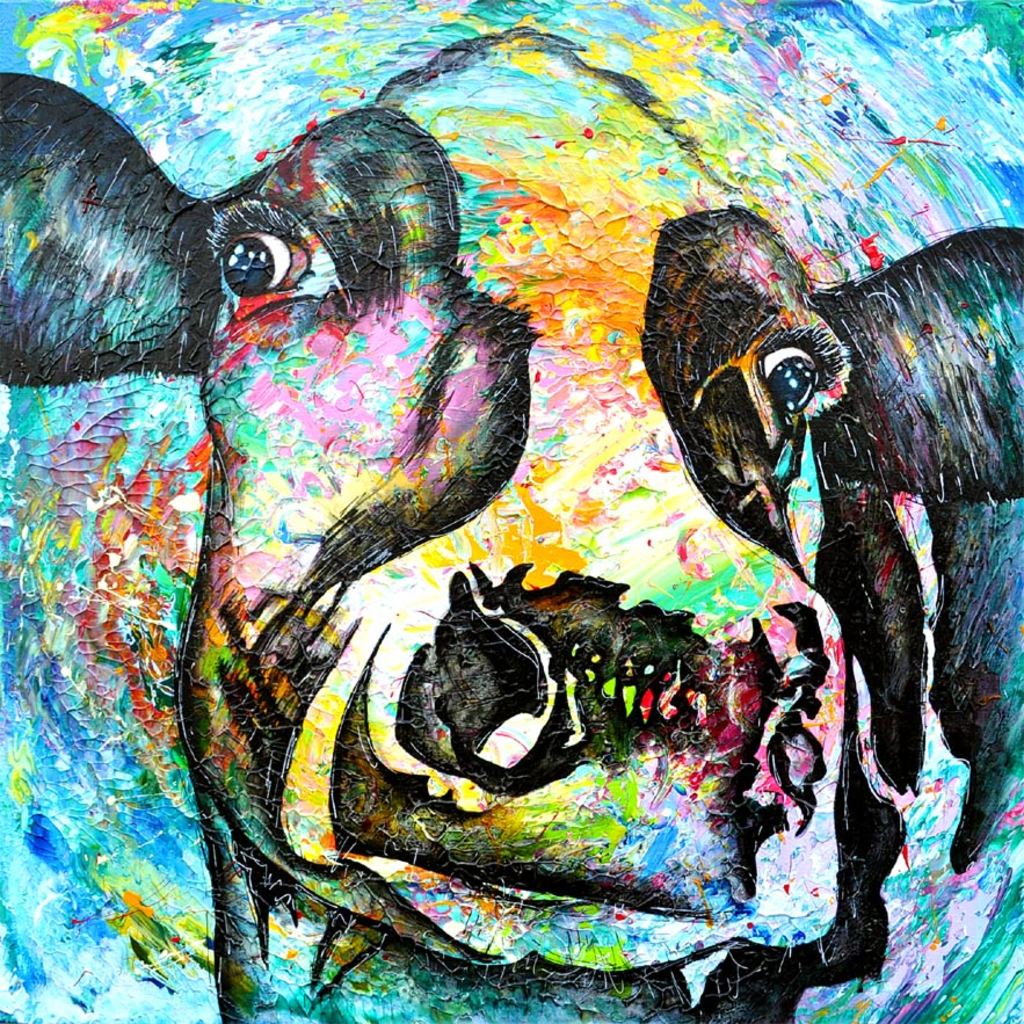 VERKOCHT. Kleurrijk koeienschilderij, 80x80x4cm.