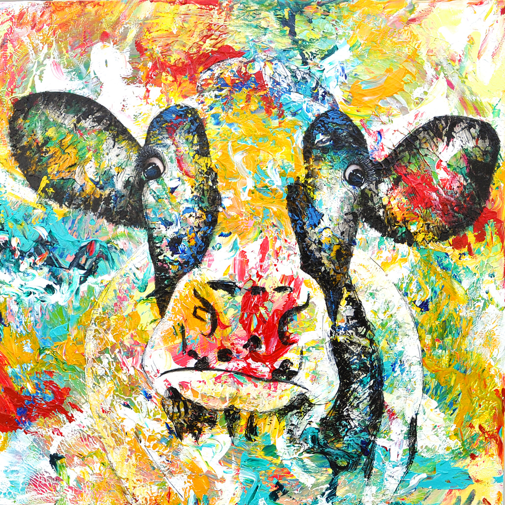 VERKOCHT. Kleurrijk koeienschilderij, 80x80x4cm.