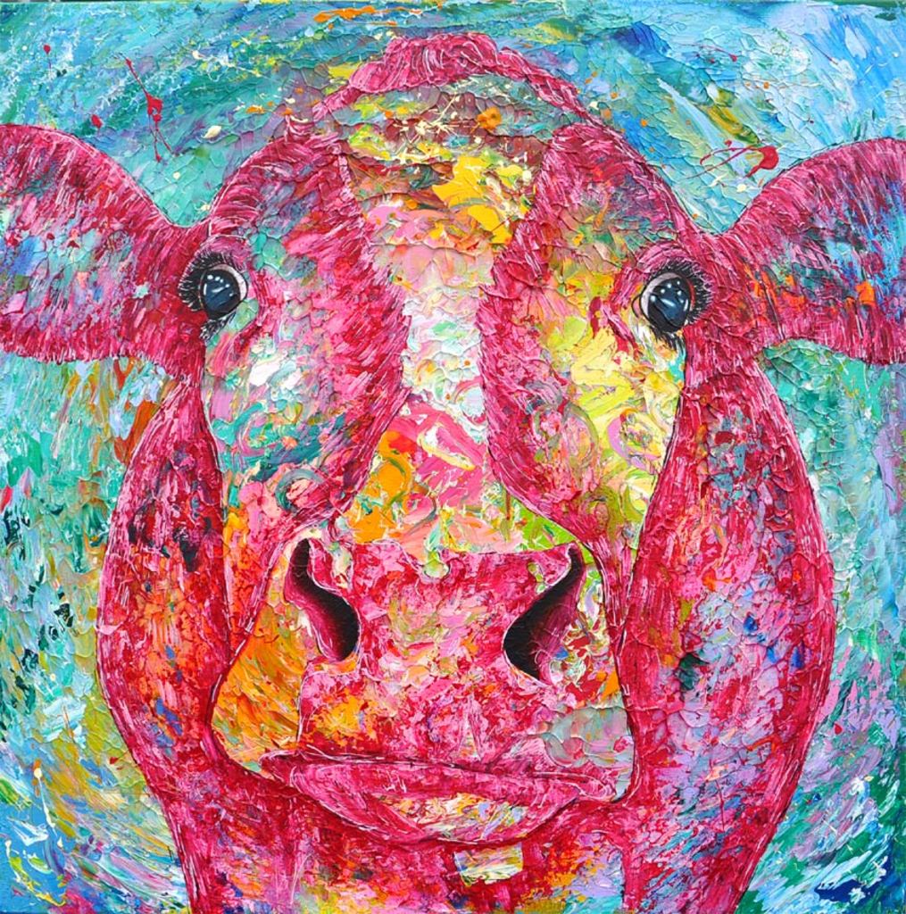 VERKOCHT. Kleurrijk koeienschilderij, 80x80x4cm.