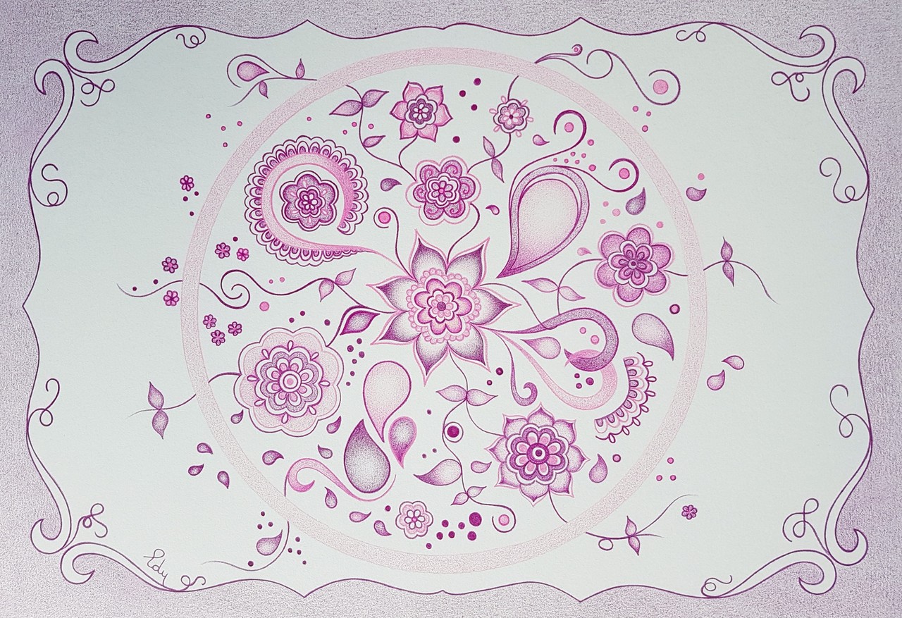 Edy combineert haar liefde voor kleuren en papier door blanco tekenvellen te vullen met in elkaar overvloeiende kleuren en mooie vormen. Vaak is een mandala de basis.