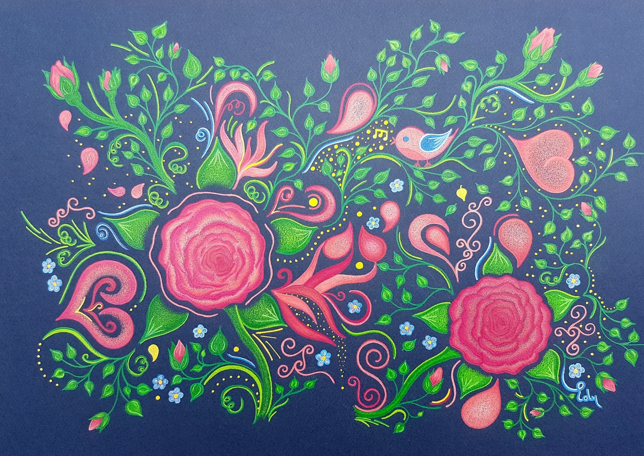 Edy combineert haar liefde voor kleuren en papier door blanco tekenvellen te vullen met in elkaar overvloeiende kleuren en mooie vormen. Vaak is een mandala de basis.