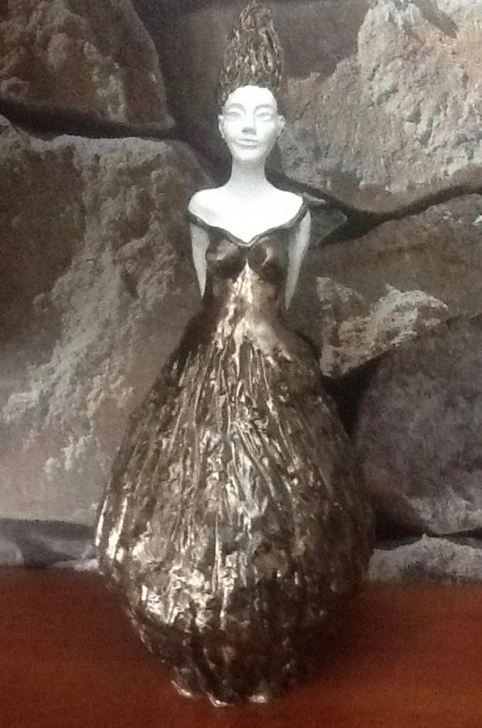 Wit keramisch vrouwenbeeld met brons geglazuurde jurk en kapsel.