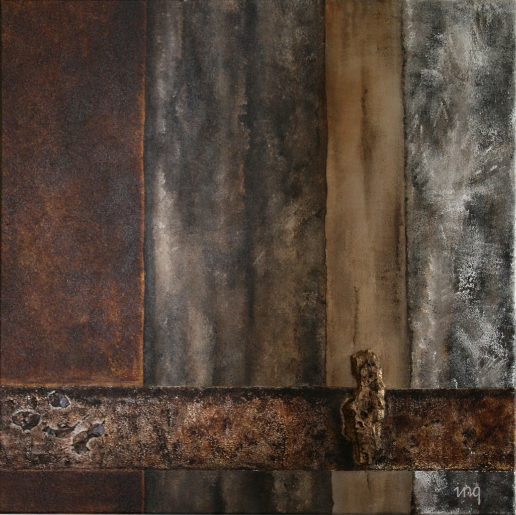 Bij dit schilderij heb ik gebruik gemaakt van een stukje schors, wat op het werk geplakt is. Het stelt de boomstammen voor met een stukje leven onder de grond. Heel subtiel is er op het stukje schors wat goud verwerkt.