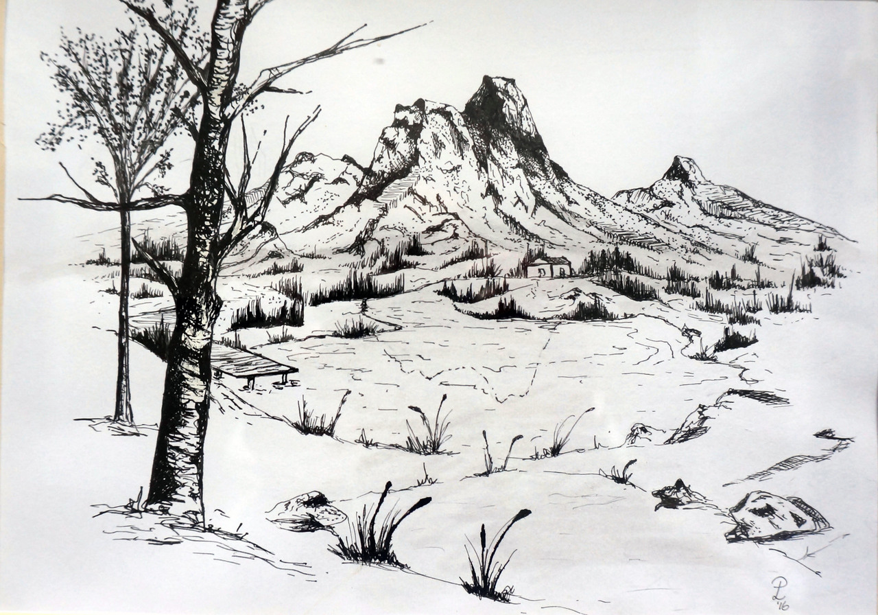Berglandschap met fineliners gemaakt.