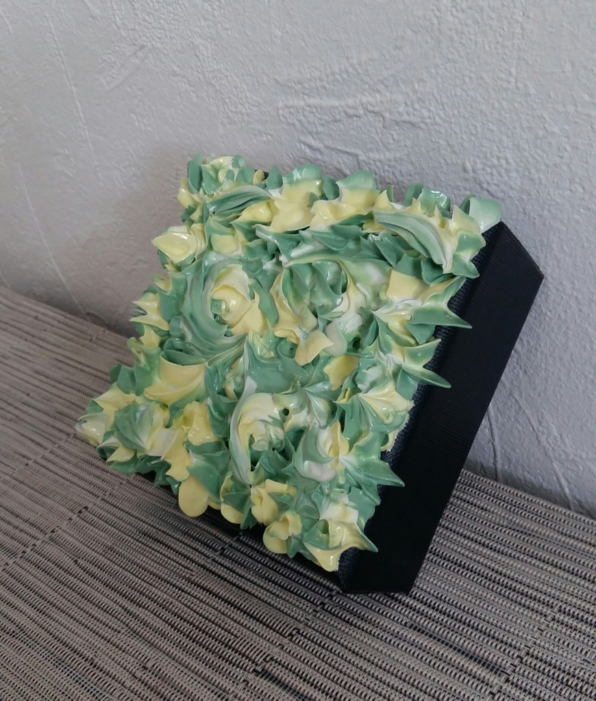 Nr. 018. Klein Verfsculptuur op canvas blok. Zachte tinten groen.