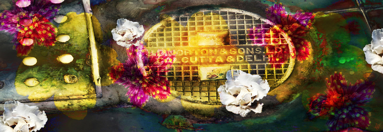 Putdeksel uit New Delhi gecombineerd met diverse bloemen.
