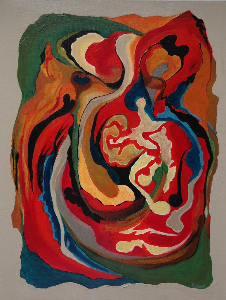 Dansen in kleur is een vrolijk schilderij van geabstraheerde mensfiguren.