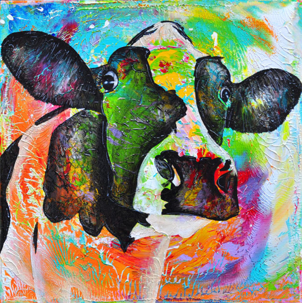 VERKOCHT. Kleurrijk koeienschilderij, 50x50x4cm.