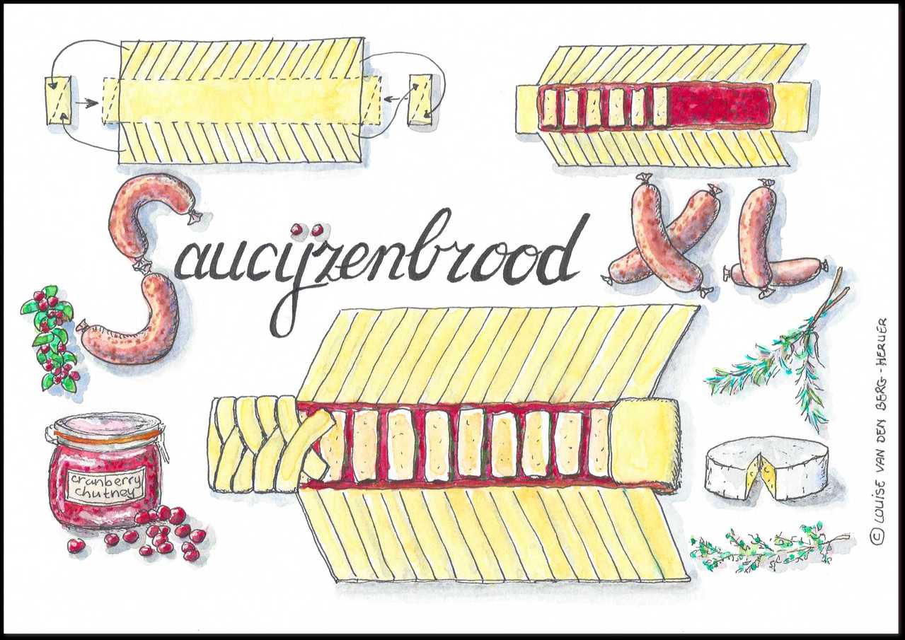 Illustratie in pen en aquarel bij het recept van "Saucijzenbrood XL". In opdracht van Tante Fanny bladerdeeg. Het is ook te zien op mijn kookblog www.keukenatelier.com 15 x 20cm