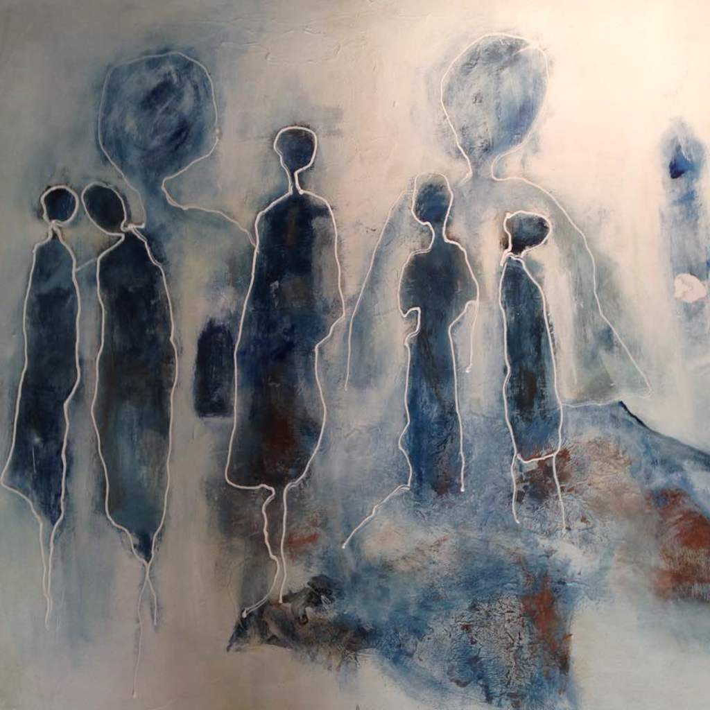 'Mijn mens' ontstaat toevallig; in een wirwar van lijnen, vlekken en kleuren zoek ik mensen (meestal vrouwen en kinderen) die met elkaar verbonden zijn en die meestal 'niet perfect' zijn.