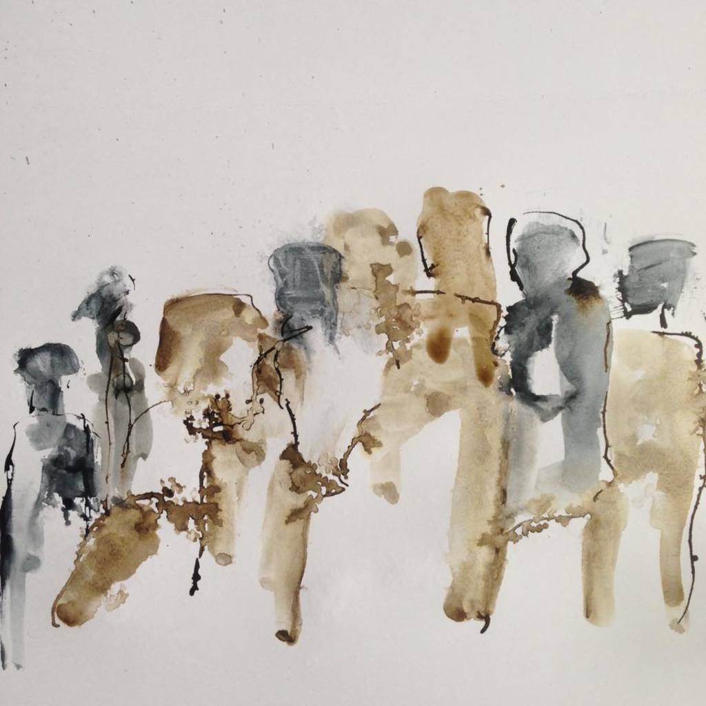 'Mijn mens' ontstaat toevallig; in een wirwar van lijnen, vlekken en kleuren zoek ik mensen (meestal vrouwen en kinderen) die met elkaar verbonden zijn en die meestal 'niet perfect' zijn.
