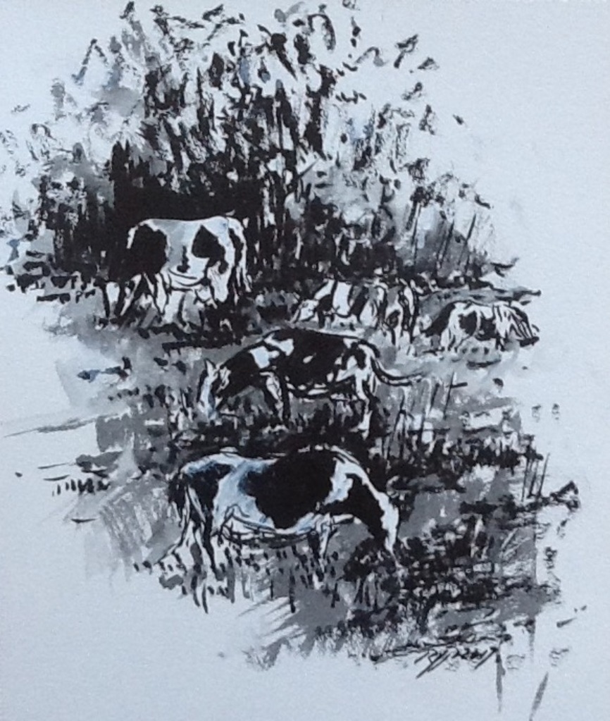 Koeien in weide- impressie- zwarte inkt op aquarelpapier-( Voorst )