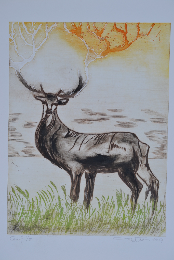 Hert 1 / Cerf 1 - droge naald en aquatint - meerkleuren druk - oplage 1/5