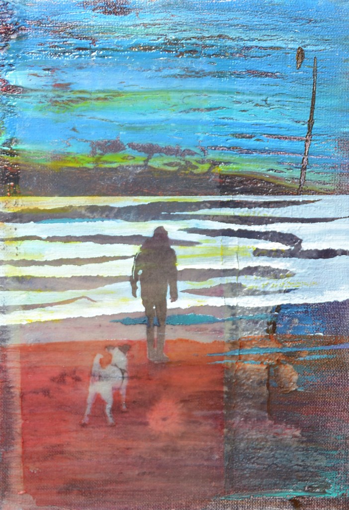 Mensen gaan samen met hun omgeving, alleen of samen. Ze worden silhouetten en versmelten met de lijnen en vlakken van het landschap.