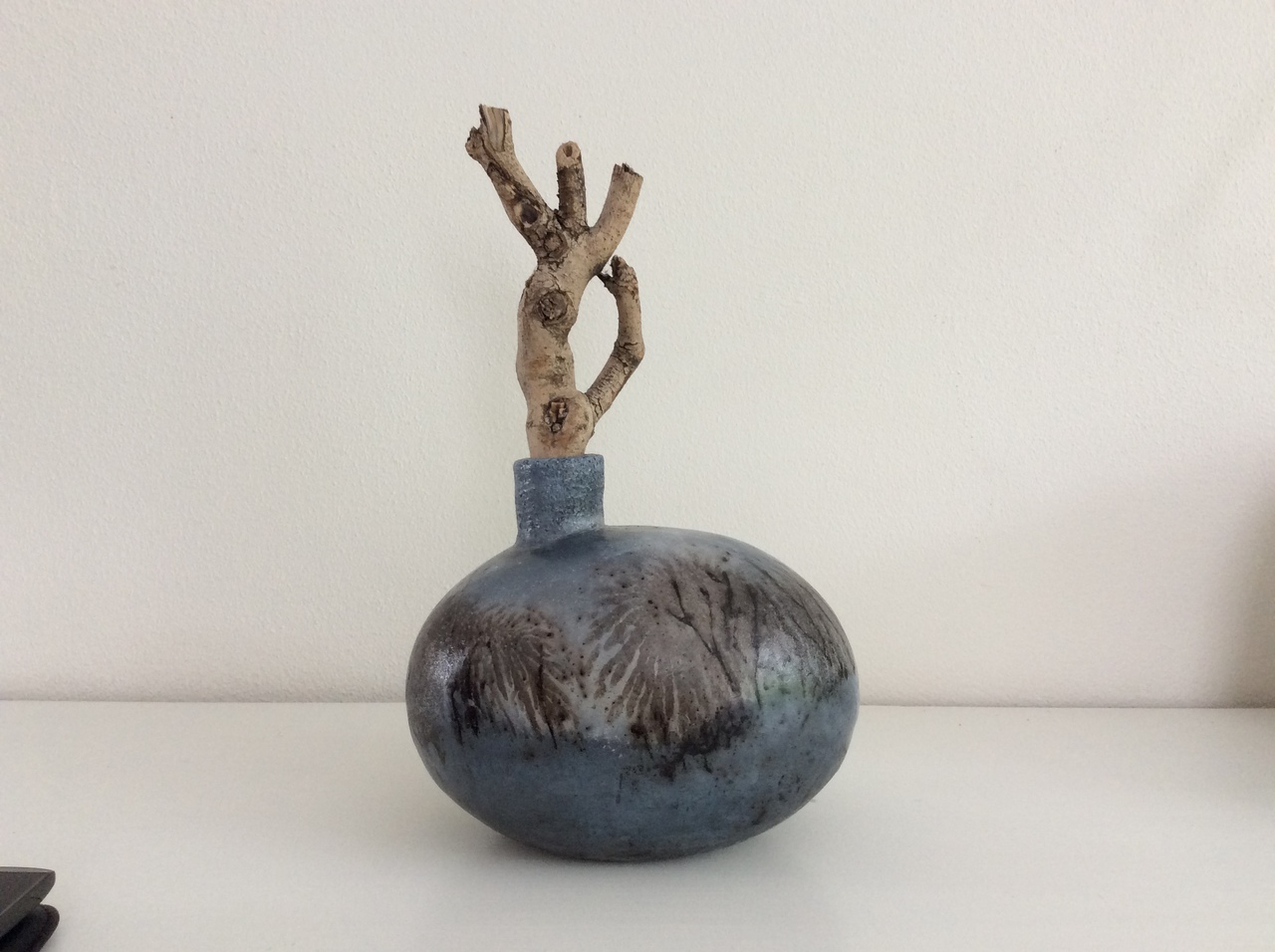 Bolvormige vaas,raku gestookt,met blauw .als decoratie een oude perentak
