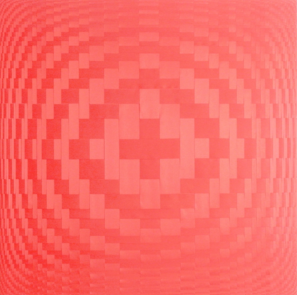Vlechtwerk gemaakt met 1 kleur satijnlint dat op een houten frame gespannen is. Door met verschillende breedtes te werken ontstaat de illusie van 3D rondingen terwijl het een plat vlak is met rechte lijnen. De lichtval zorgt voor een extra effect als je er langs loopt, maar ook het licht van buiten laat het werk er anders uitzien gedurende de dag. Maat is 102,5 x 102,5 cm.