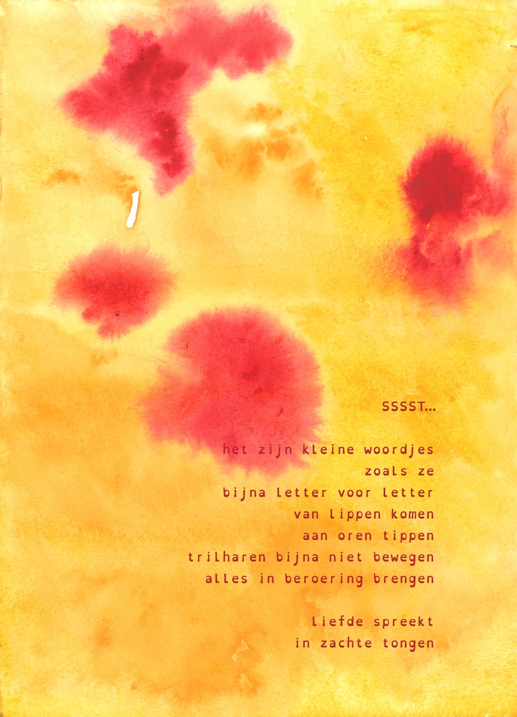 sssst … het zijn kleine woordjes zoals ze bijna letter voor letter van lippen komen aan oren tippen trilharen bijna niet bewegen alles in beroering brengen liefde spreekt in zachte tongen gedicht op aquarel