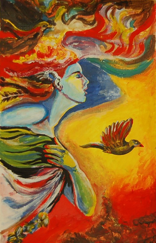 vrouw kijkt uit, wil zelf de vogels achterna vliegen