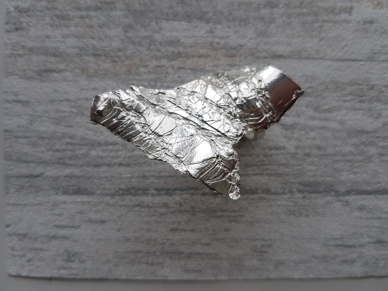 Parachute In de oorlog waren parachutes vaak het redmiddel voor de piloot die uit zijn vliegtuig moest springen om zo toch een veilige landing te kunnen maken. De stof bleef dan vaak rondzwerven tot hij uiteindelijk misschien hergebruikt werd tot één of ander doeleind. Als herinnering daaraan werd dit juweel ontworpen. De fragiele dunheid van de stof, de lichte indrukken van de stiksels, en uiteindelijk de vorm, waardoor het juweel als het ware gedrapeerd wordt over vinger en een deel van de hand. Parachute Pendant la guerre les parachutes servaient de dernier recours aux pilotes pour pouvoir atterrir en toute sécurité. Le tissu se perdait dans la nature pour finalement être réutilisé dans un but bien précis. Ce bijou a été réalisé en souvenir de ces parachutes. La finesse fragile du tissu et les traces des coutures ont contribué à sa forme finale. Le bijou se drape de façon fluide autour du doigt et de la main.