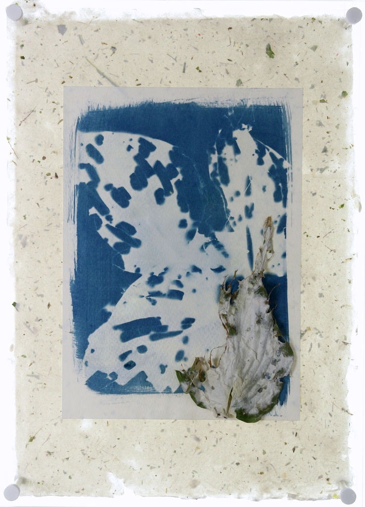 Sunprint op handgeschept papier met een collage van planten gecoat met handgeschept papier. 3D