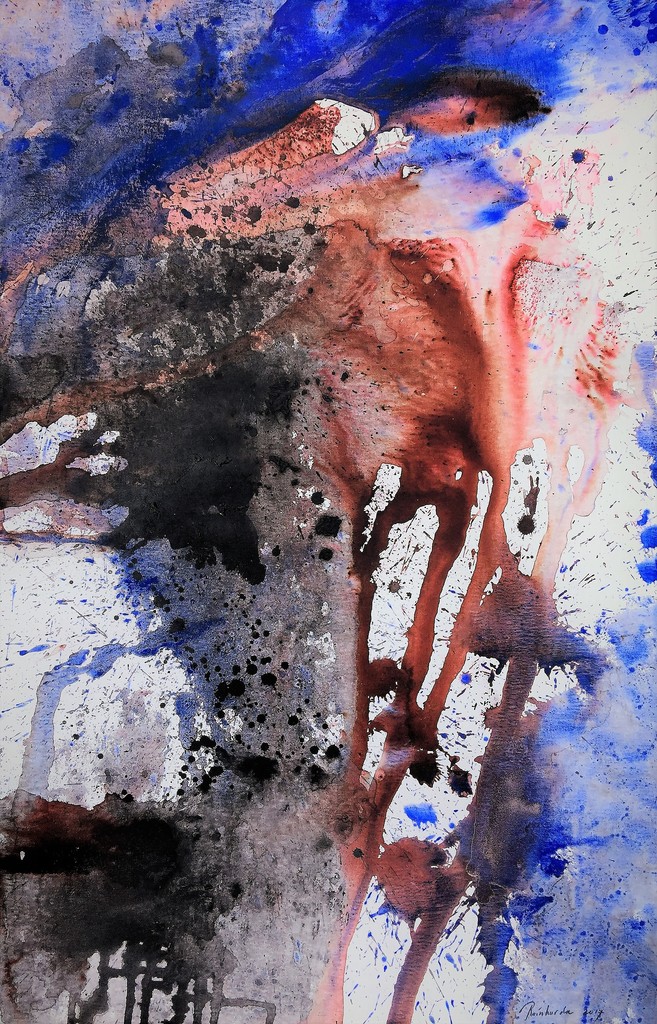 OI inkt. , bister, kobaltblauw pigment op doek en frame. Geïnspireerd door de vallei van de Dordogne. De steeds veranderende wolkenluchten, zonnestralen en wind.spelend in het groen. Reinharda Drijfhamer en Linda Paes werkten in de zomer van 2017 aan een plein air project. Slagschaduwen op het doek, afdrukken van takjes, grassen, moddersporen, verbrande resten, verdord bananenblad. Inspiré par la vallée de la Dordogne. Les nuages en constante évolution. Les rayons du soleil et le vent jouent au vert. Reinharda Drijfhamer et Linda Paes ont travaillée plein air ensemble pendant l'été 2017. Les ombres sur la toile, les estampes de brindilles , graminées, les traces de boue, le charbon brûlé, les feuilles mortes de bananier.