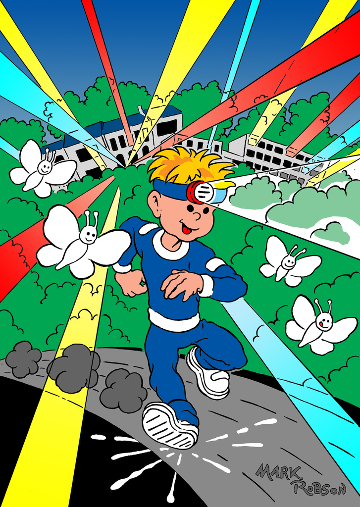 Illustratie voor de flyer van de jaarlijkse "Vlinder-Loop" op school, een loop-event waarbij kids en ouders met een loopmotivatie, 's avonds langs een verrassend spectaculair kleurig verlicht parcours, en ondergedompeld in pittige muziek, door de schoolgebouwen en hun nachtelijke hallen en gangen kunnen lopen. Avonden zoals deze brengen ongeziene magie... - Illustratie: Chinese Inkt gecombineerd met digitale inkleuring. -