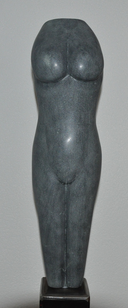 "Zij "............is pure schoonheid. "Zij " , stond model voor dit beeld. Met veel liefde en aandacht gemaakt van groen/zwarte Serpentijn uit Zimbabwe. Het blok woog onbewerkt : 34 kilo. Hoogte: 55 cm Prijs: 395,- ( excl. console )