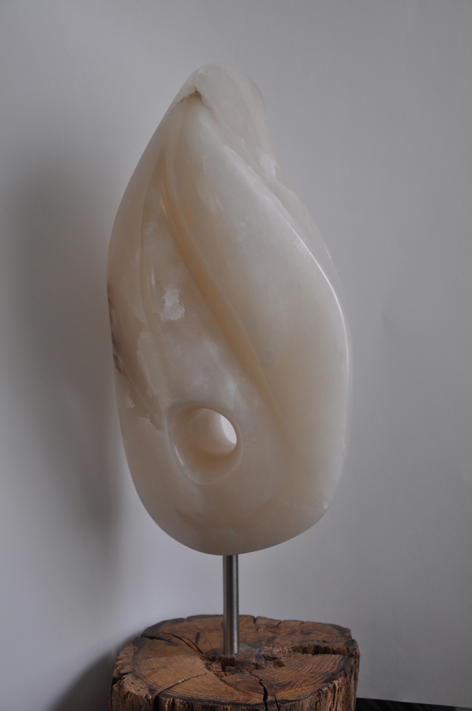 Laat je zintuigen prikkelen : de Tulp ! Kijk verder, kijk er doorheen, en zie de schoonheid. Inspiratie uit onze groene omgeving. Een abstracte vormgeving. Beeld gemaakt van witte Albast Hoogte: 55 cm Prijs: 395,- ( excl. console ) >> Verkocht