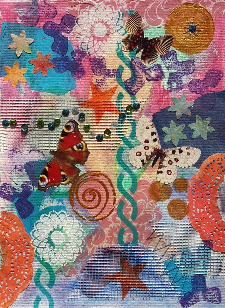 Collage op papier, waarbij gebruik is gemaakt van acrylverf, stempels en sjablonen