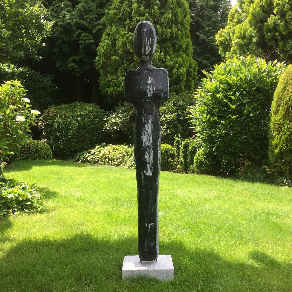Wakend en bewakend in zijn omgeving. Rust en ruimte, in alles wat hij/zij (?) doet.... Materiaal: katoenen doeken, bewerkt met Paverpol. Hoogte: 125 cm. Prijs: 145,- euro ( incl. console )