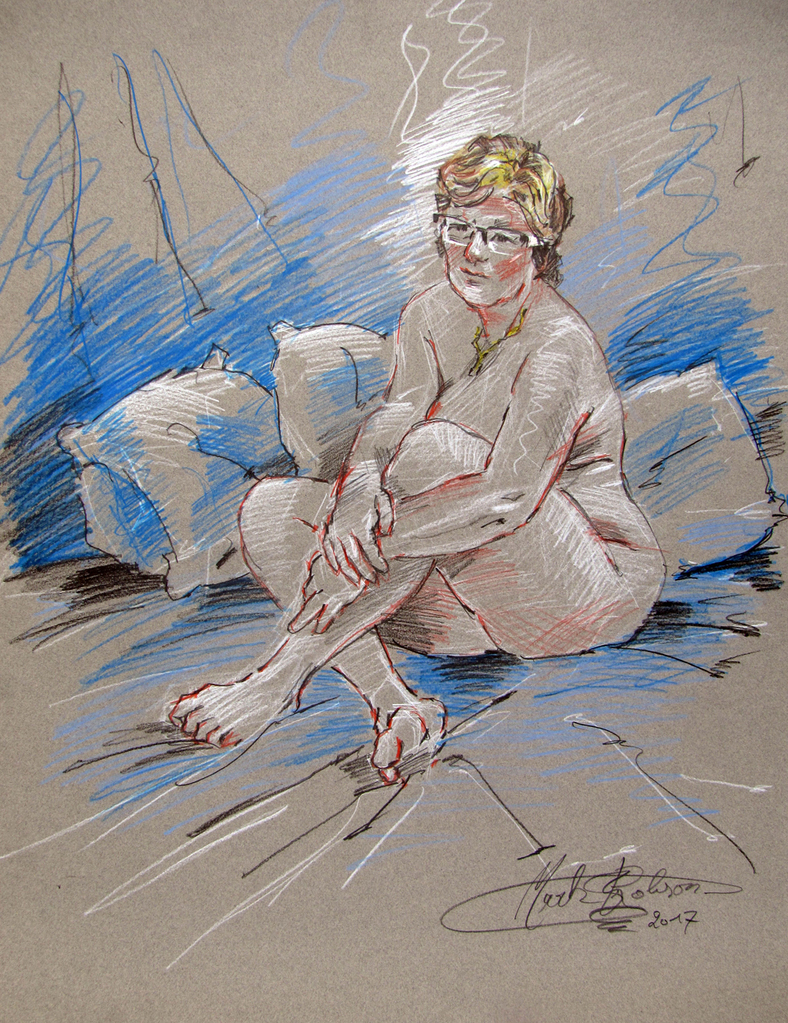 Van de 3 feeën kreeg het meisje telkens een kussen in het helderste blauw. Eén kussen voor inspiratie, één kussen voor vreugde, één kussen voor vertrouwen... - Model: Melina van Es - Pastelpotlood op Cansonpapier. -