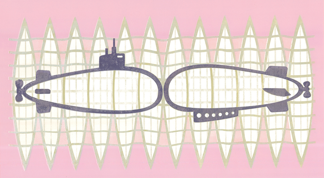 Een variatie op het thema zeppelins en onderzeeërs.Een variatie op het thema zeppelins en onderzeeërs. De prent is tot en met de schepranden van het papier gedrukt. Doordat elke prent net weer anders is, zijn het unieke exemplaren binnen een reeks. Neem gerust contact met mij op wanneer je graag ook de andere kleurstellingen wilt zien.
