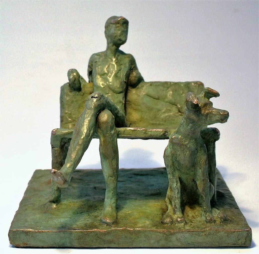 Man-with-dog-on-couch Dog-sculpture Beeld-hond-brons Hondje-in-brons Man-met-hond-brons